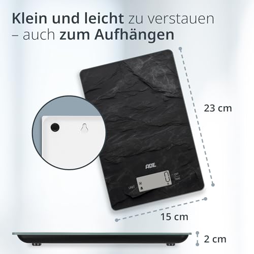 Mit ihren kompakten Maßen von 23 x 15 x 2 cm benötigt die Waage nur wenig Platz in deiner Küche. Der flache Aufbau und die praktische Aufhängeöse auf der Rückseite bieten dir vielfältige verstau- und Aufbewahrungsmöglichkeiten. Zudem garantieren die Antirutschfüße Stabilität beim Wiegen, sodass du dir keine Sorgen um ein Abrutschen machen musst.