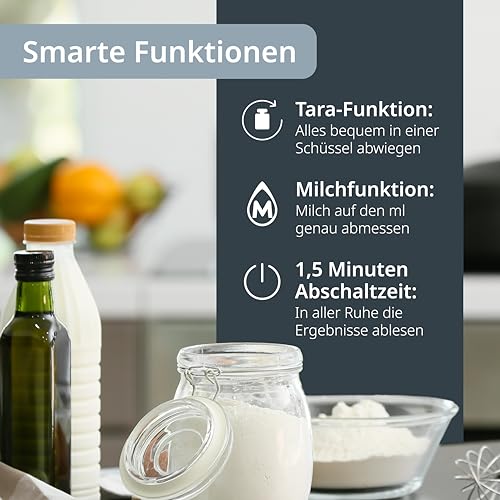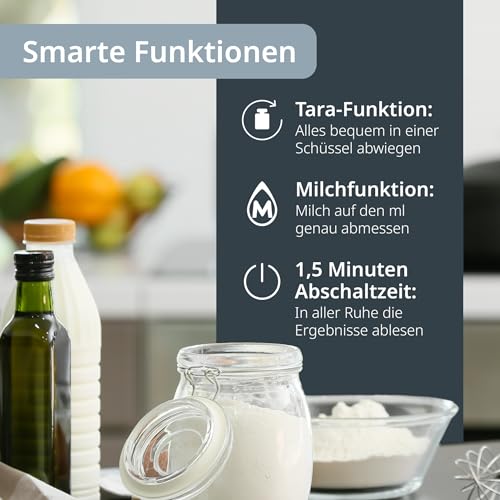 Die Waage bietet spezielle Funktionen für verschiedene Lebensmittelarten – sei es Flüssigkeiten, feste Lebensmittel oder Milch. Sie unterstützt alle gängigen Einheiten (g, ml, fl:oz, lb:oz) und macht die Verwendung kinderleicht. Die intuitiven Sensortasten ermöglichen eine unkomplizierte Bedienung, sodass du dich ganz auf das Kochen konzentrieren kannst.