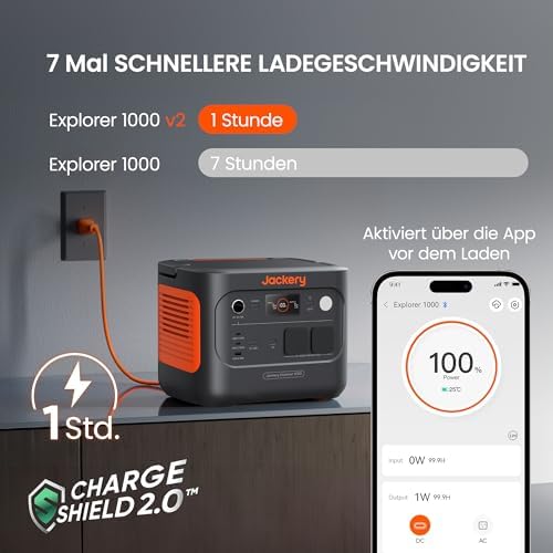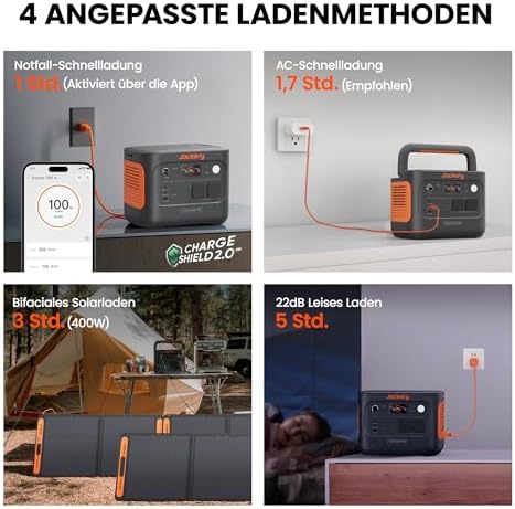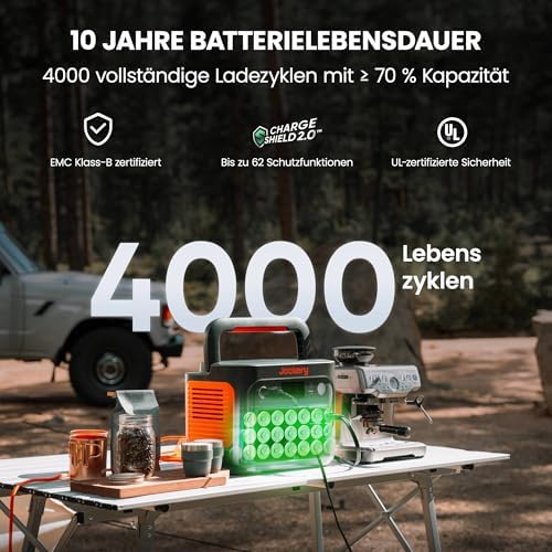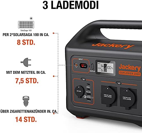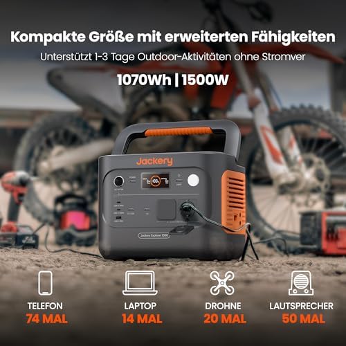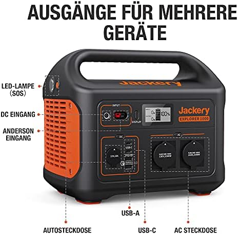 Mit einer beeindruckenden Kapazität von 1002Wh bietet der Jackery Explorer 1000 ausreichend Energie für mehr als 90% aller elektrischen Geräte, darunter Fernseher, Elektrolüfter, Elektrogrills, Standmixer und viele weitere. Perfekt für Abenteuer im Freien, Campingausflüge oder auch als zuverlässige Notstromversorgung für den Garten oder Ihr Zuhause.