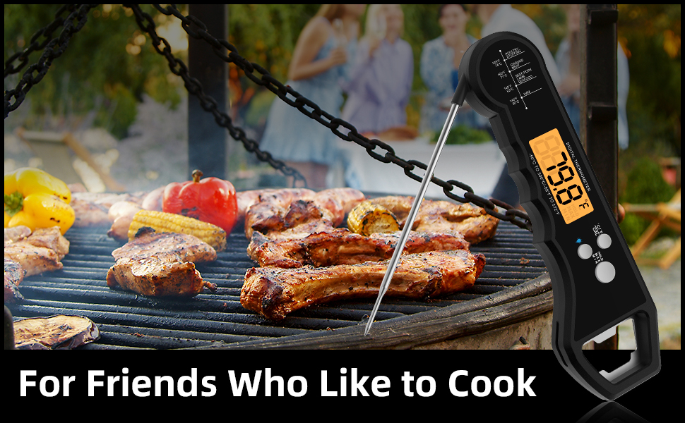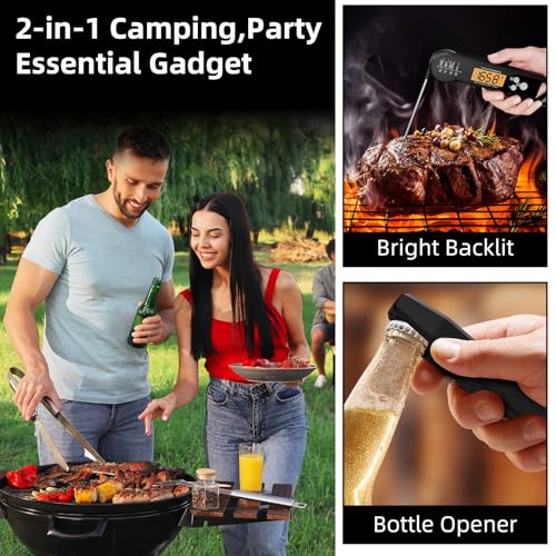 Genießen Sie die Vielseitigkeit unseres digitalen Fleischthermometers mit LCD-Hintergrundbeleuchtung. Egal, ob in hellen oder schwach beleuchteten Umgebungen, die Anzeige ist immer gut lesbar. Zusätzlich fungiert das Thermometer auch als praktischer Flaschenöffner – das ideale Gadget für gesellige Runden mit Familie und Freunden.