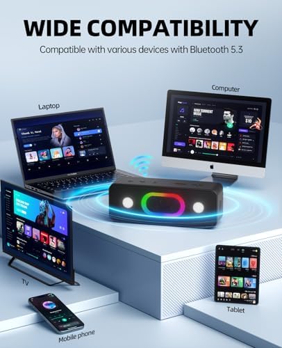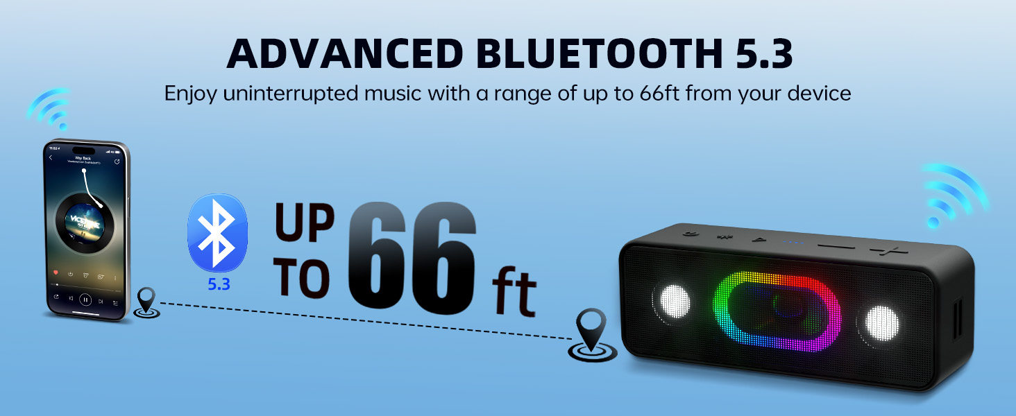 Genießen Sie Musik ohne Unterbrechungen dank der verbesserten Bluetooth 5.3 Technologie, die 33% weniger Verbindungsabbrüche gewährleistet. Mit einer Reichweite von bis zu 30 Metern können Sie mühelos Ihre Geräte verbinden. Zusätzlich bietet die 3,5-mm-AUX-IN-Buchse (nicht im Lieferumfang enthalten) noch mehr Anschlussmöglichkeiten für Ihr persönliches Musikvergnügen.