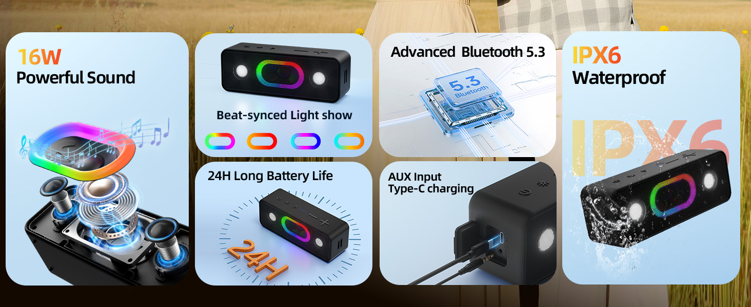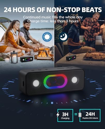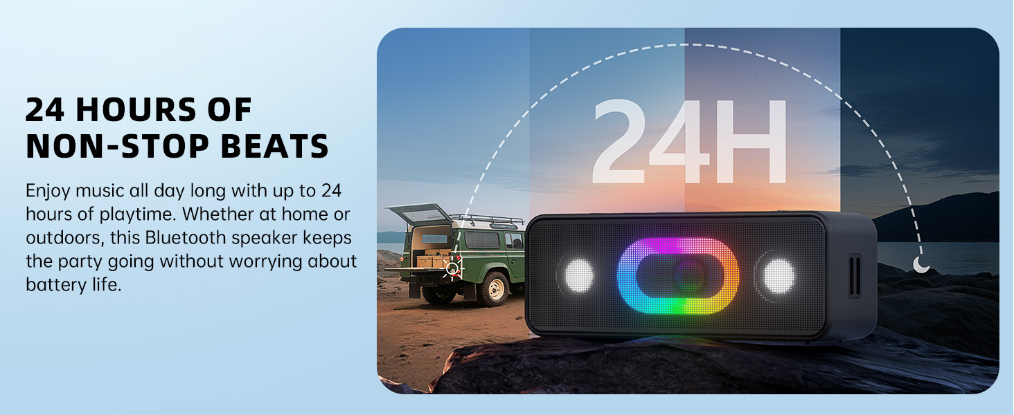 Dieser Bluetooth Lautsprecher bietet beeindruckende 24 Stunden Wiedergabezeit, sodass Ihre Musik Sie den ganzen Tag begleitet. Ob beim morgendlichen Kaffeegenuss, am Lagerfeuer oder bei einem Ausflug zum Strand – genießen Sie Ihre Lieblingsmelodien ohne Pause. Perfekt für jede Gelegenheit, sei es beim Reisen, Arbeiten oder einfach beim Entspannen. Immer bereit, um Ihre Stimmung zu heben!