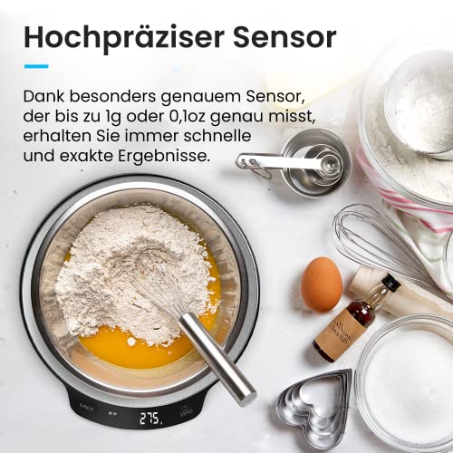 Eine der herausragenden Eigenschaften dieser Küchenwaage ist die Möglichkeit, zwischen vier verschiedenen Gewichtseinheiten zu wählen: Gramm, Milliliter, Pfund und Pfund:Unze. Zusätzlich können Sie zwischen allgemeinen Maßeinheiten wie Gewicht, Milch- und Wasser-Volumen umschalten, was die Nutzung noch flexibler gestaltet.